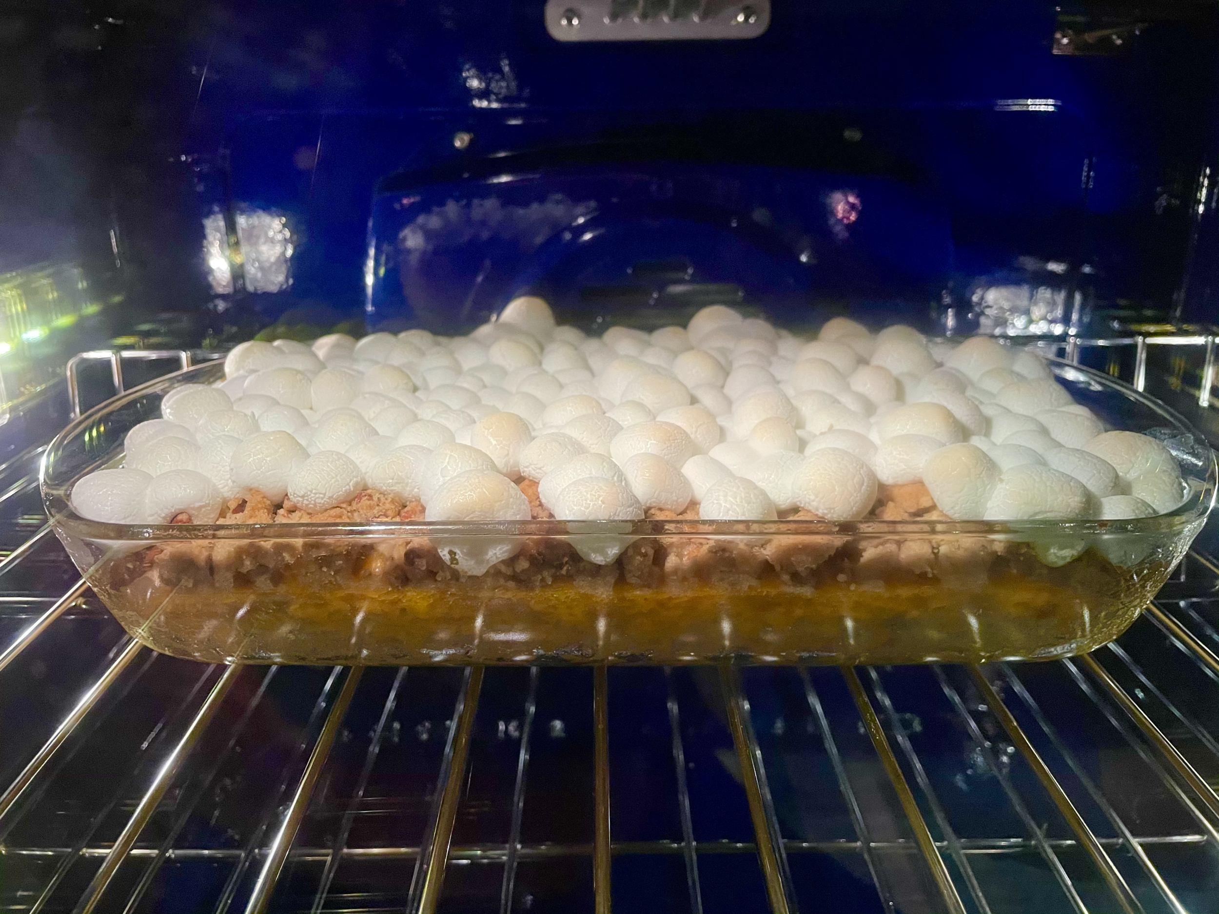 Remove the casserole from the oven, cover the top with marshmallows, and return to the over for a final 5 minutes, or until the marshmallows are golden brown on top.